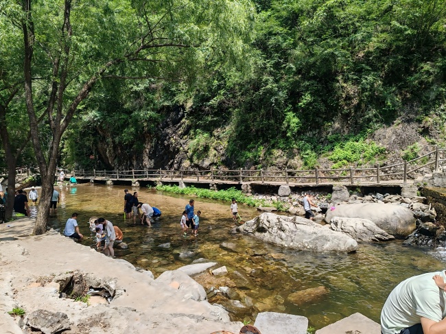 從王府竹海的售票處步行約20分鐘,我們抵達了檢票口。一進入景區,一股沁人心脾的涼意便撲面而來,仿佛瞬間進入了一個天然的大空調。正如期待中的那樣,王府竹海果然名不虛傳!它被譽為“欒川的小重渡溝”,進山后沿水系棧道前行,清泉飛瀑隨處可見,原始自然的生態環境讓人沉醉。我們沿著蜿蜒的棧道,溯流而上,或駐足觀賞那從崖壁間奔涌而下的飛瀑,感受其磅礴氣勢;或俯身嬉戲于清澈見底的山泉,享受那份難得的清涼與童趣。由于景區基本是原路去原路回的設計,所有的山泉飛瀑均能盡收眼底,讓我們大飽眼福。近3—4小時的游覽,大家雖略感疲憊,但身心卻得到了極大的放松與愉悅。