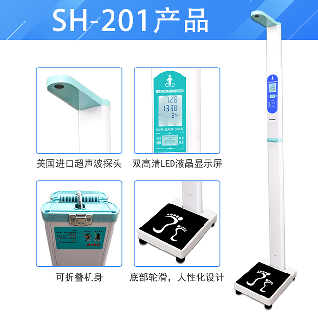 上禾SH-201打印款智能雙屏電子身高體重測量儀,作為專業體檢設備,采用美國進口Sens Comp超聲傳感器,同時具備環境溫度自動補償功能,身高分度0.01cm,體重分度0.01kg;雙屏設計均為液晶顯示屏,上屏5寸,顯示身高、體重、BMI身體健康指數,下屏3寸,顯示二維碼和使用單位宣傳語;全自動測量、液晶電子顯示、語音播報三合一,數據可通過RS232接口、藍牙等功能進行傳輸保存;自動高速熱敏打印,結果易于儲存,支持微信掃碼,測量結果直達手機。