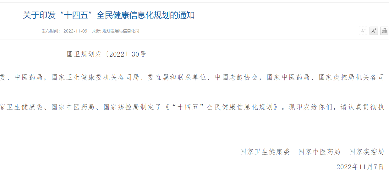 為貫徹落實黨中央、國務院的決策部署,統籌推動全民健康信息化建設,進一步推進新一代信息技術與衛生健康行業深度融合,將數字技術與系統思維貫穿到健康中國、數字中國建設的全過程,充分發揮信息化在衛生健康工作中的支撐引領作用,國家衛生健康委聯合國家中醫藥局和國家疾控局根據全民健康信息化工作面臨的新形勢新任務,堅持“統籌集約、共建共享,服務導向、業務驅動,開放融合、創新發展,規范有序、安全可控”的基本原則,以引領支撐衛生健康事業高質量發展為主題,編制印發《“十四五”全民健康信息化規劃》(以下簡稱《規劃》)。