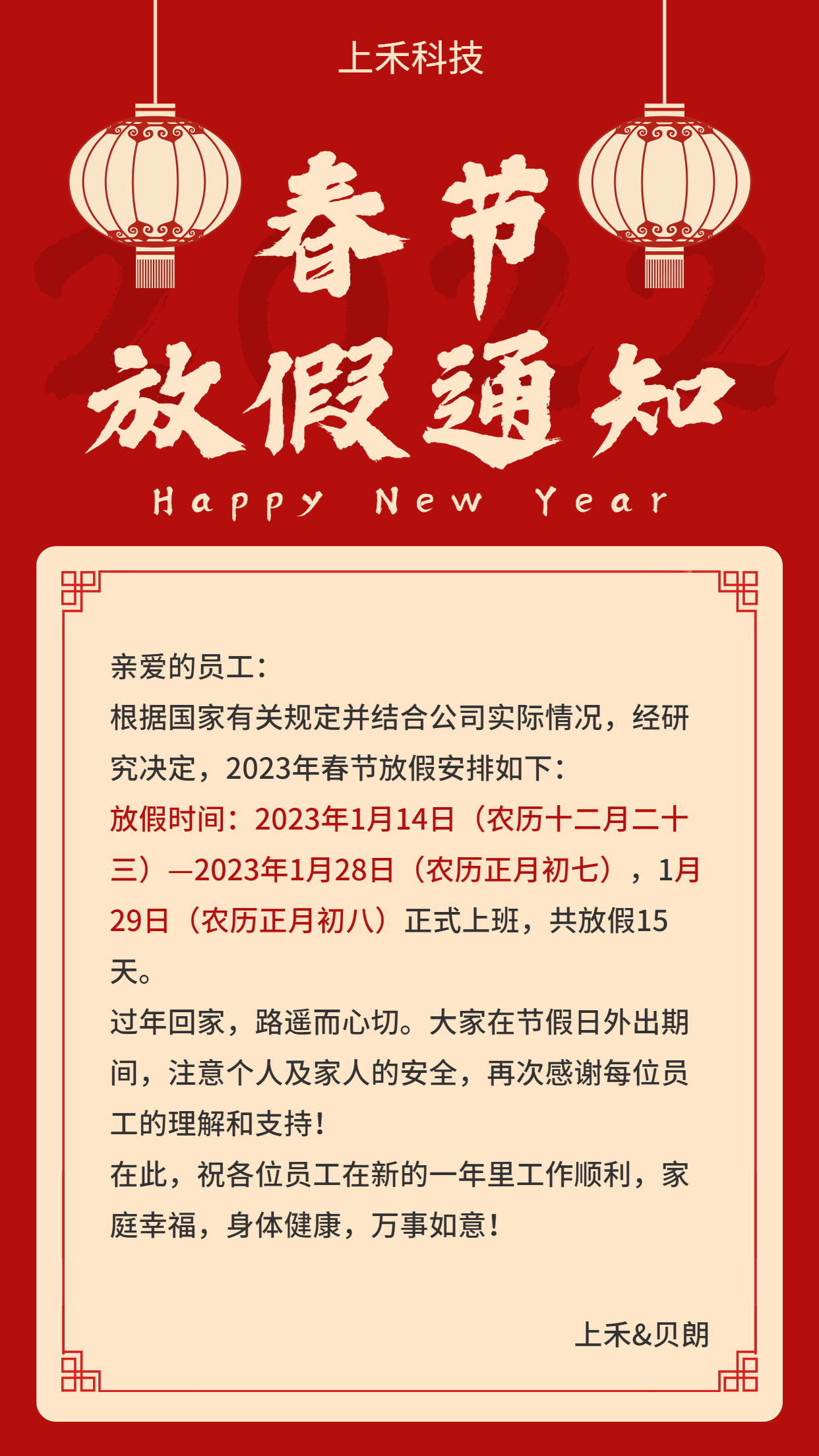 2023春節(jié)即將到來,感謝您一如既往的支持與厚愛,在此之際上禾向您致以節(jié)日的問候,祝大家新年快樂,平安喜樂!
